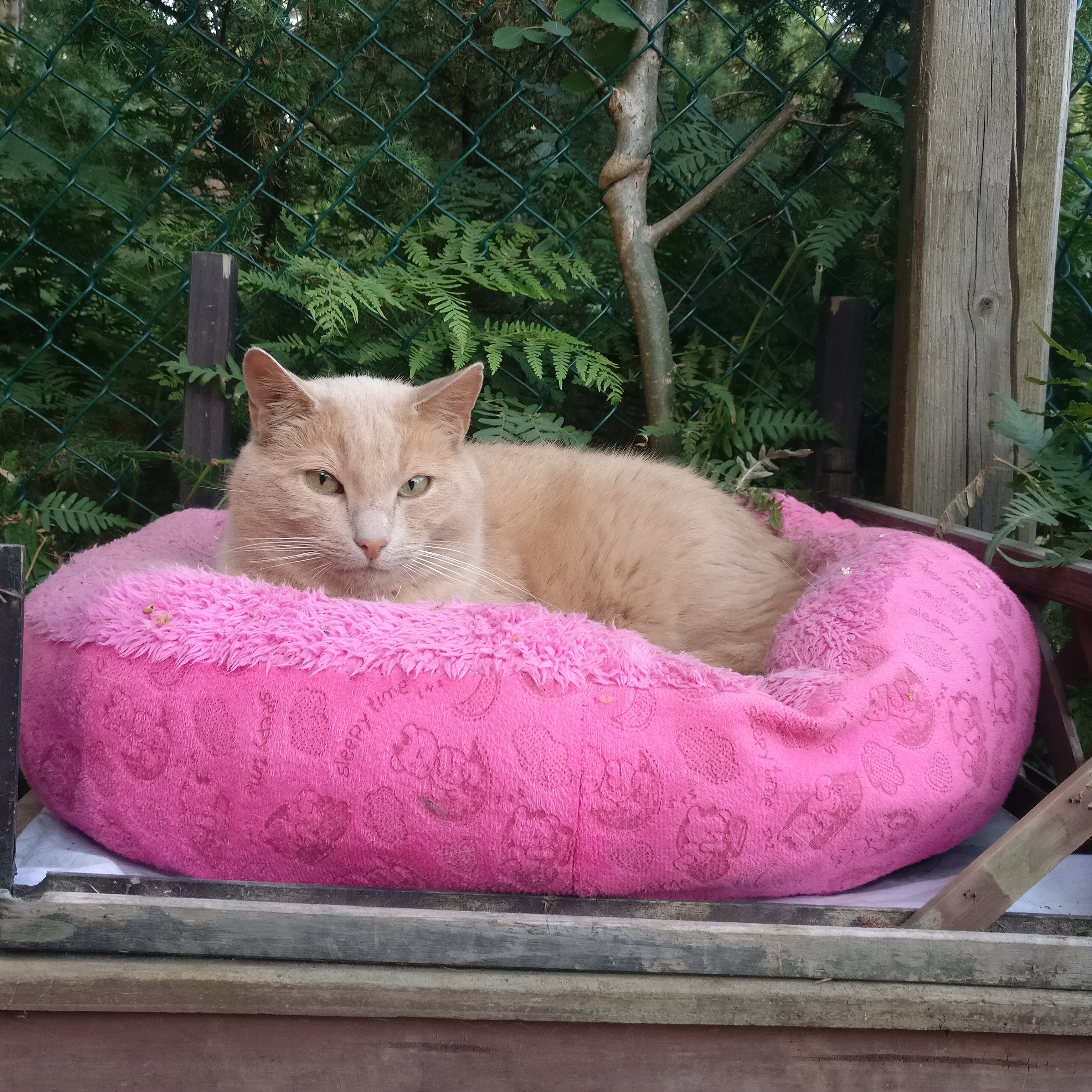 Hos kvinnan var han främst innekatt, men gick ut ibland på sommaren. Benjamin var stöddig mot annan katt i hemmet och vistelsen hos henne var bara tillfällig, fick flytta till oss för att finna en permanent familj.