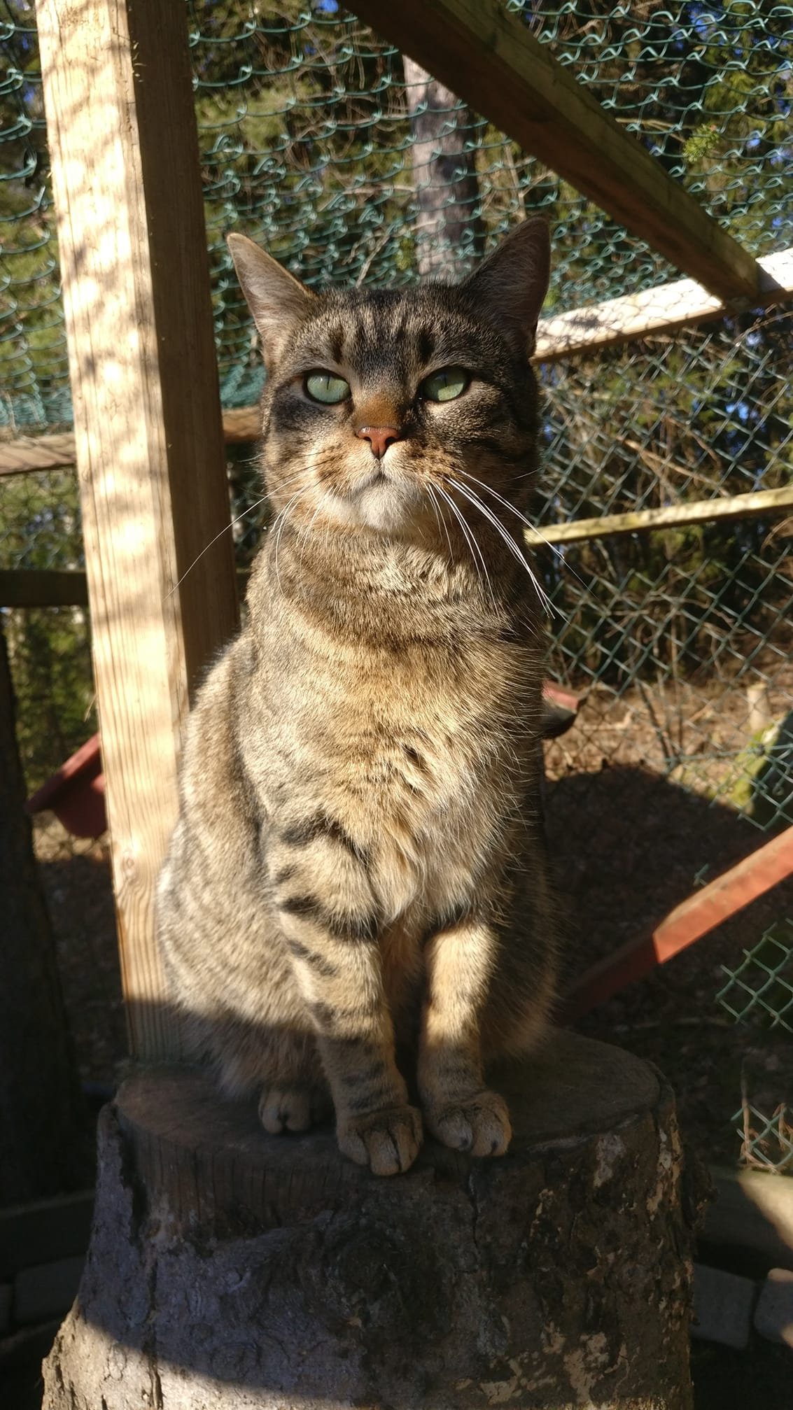 Är klar hos veterinär. Uppskattad ålder är 4-5 år. Tandsten borttagen, i övrigt fina tänder och vid god hälsa. Snäll med andra katter och duktig med lådan.