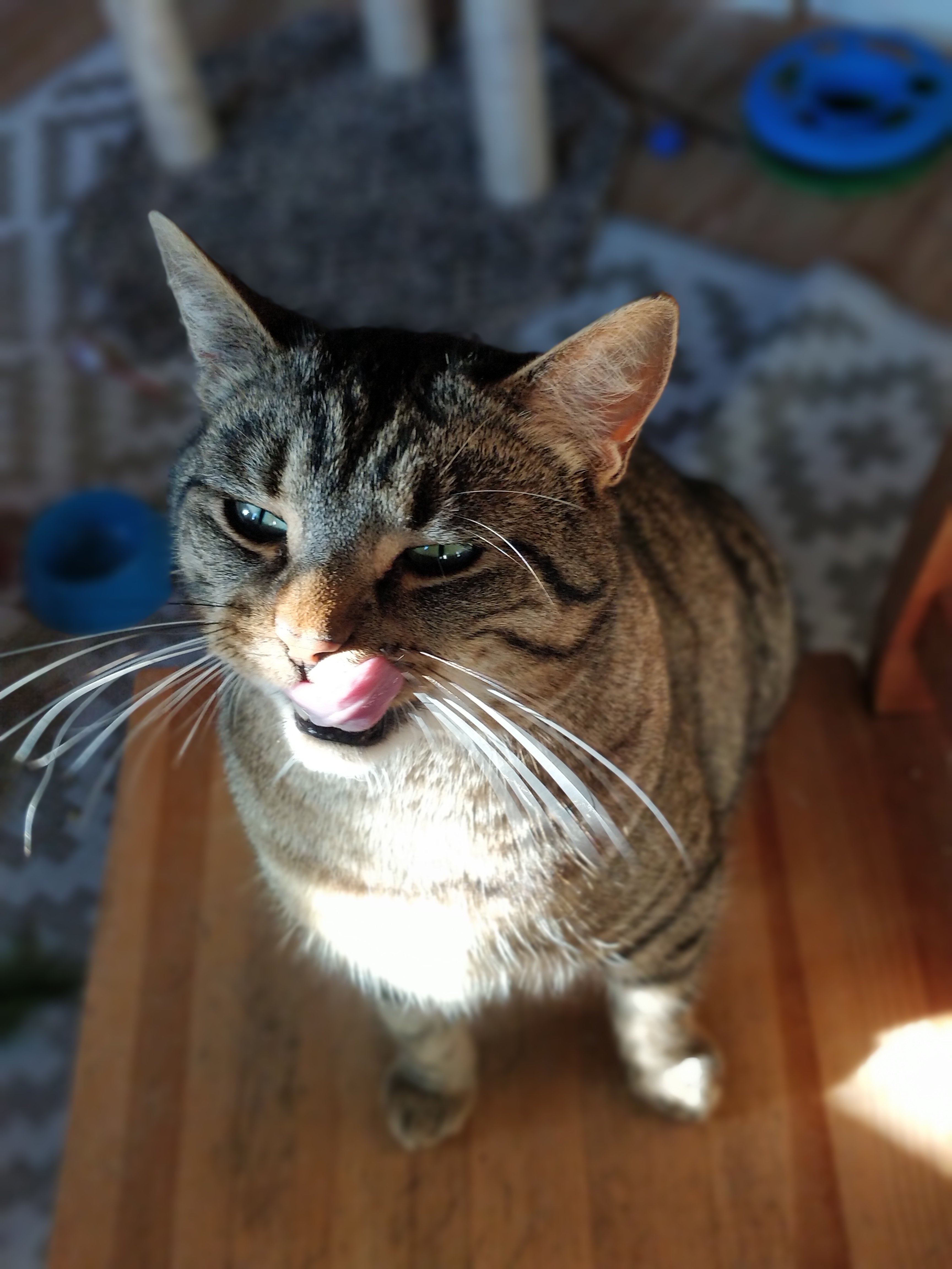 Hemlös kisse som sökt sig in i hus i Lundby, Örebro, under sommaren 2020, för att få mat och omtanke. Okastrerad och omärkt.