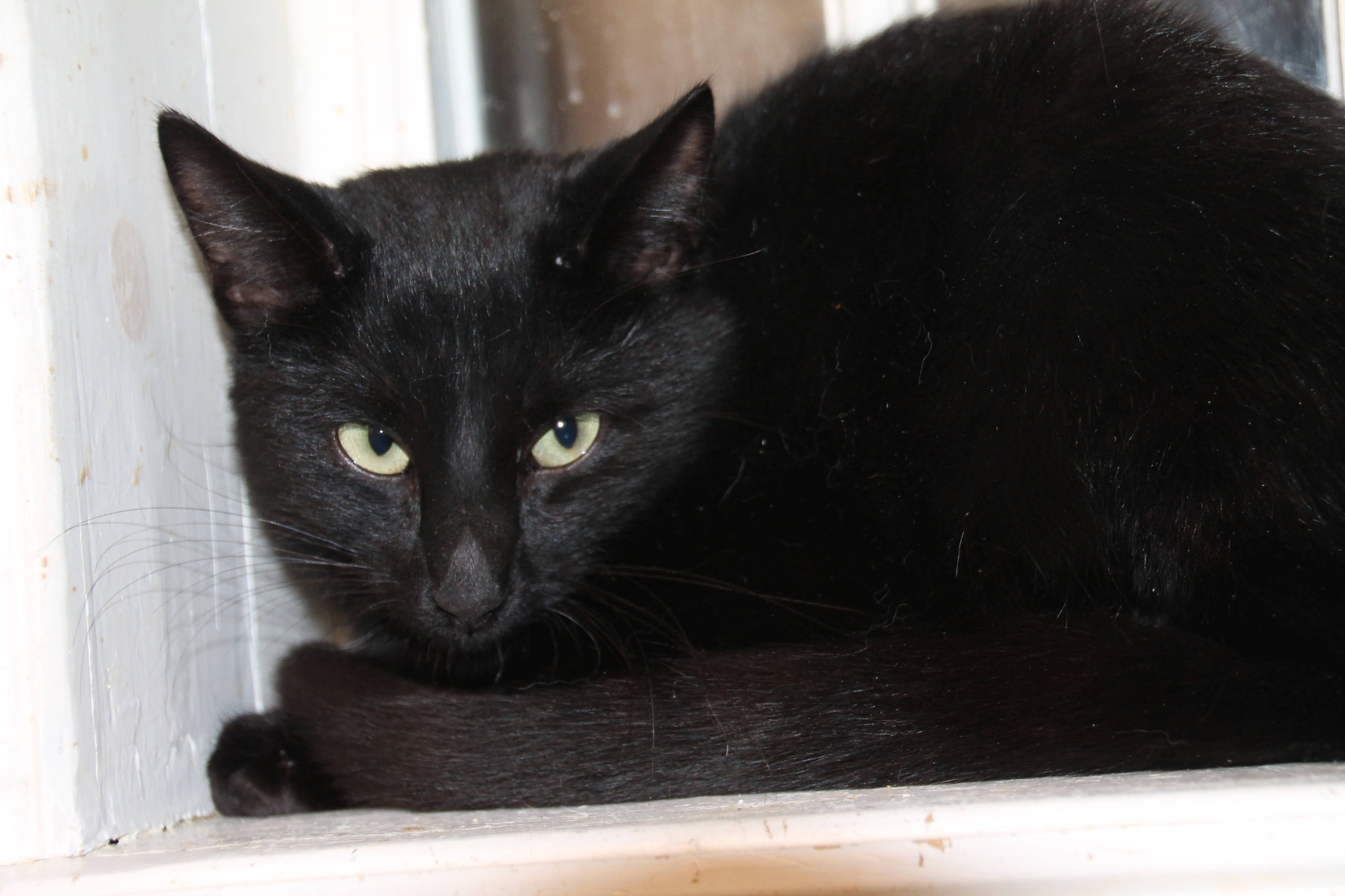 Liten svart misse med några få vita strån på bröstet. Är blyg men går att klappa försiktigt. Söker någon med tålamod och förståelse. Matglad och sköter alltid lådan. Snäll mot andra katter.