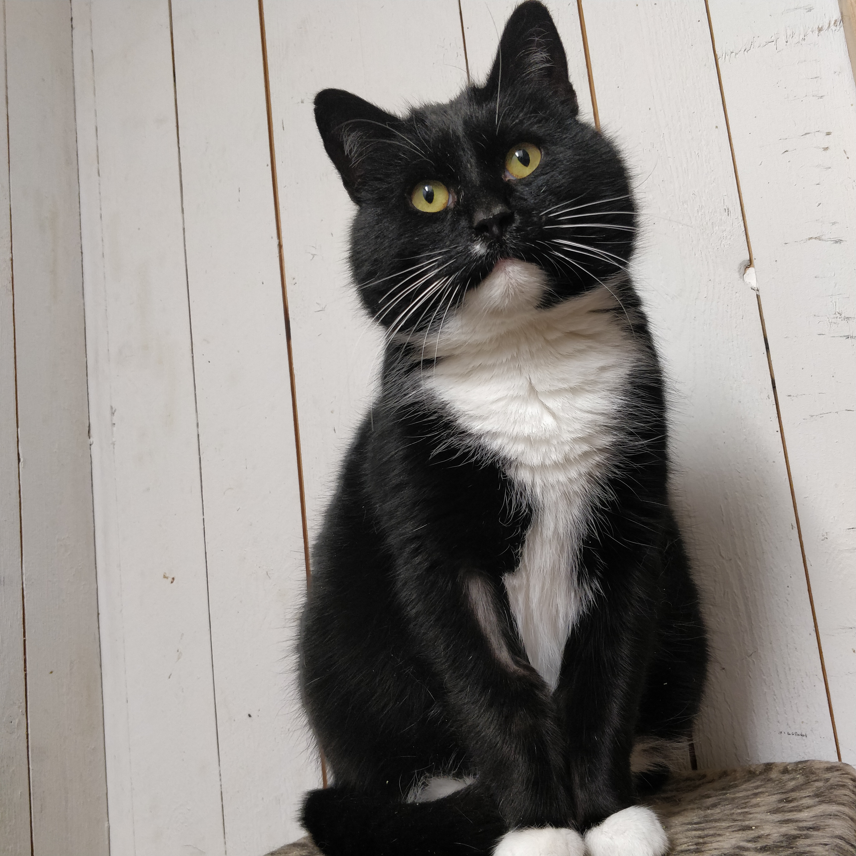 Har setts gå hemlös under två års tid, gått på stora avstånd på landsbygden. Okastrerad, vilket ledde till bråk med andra katter. Har sökt mat i sopor för att dämpa sin hunger. Har upplevts väldigt skygg och har inte gått att komma nära, men när han gick i fällan visade det sig att han var van med människor. Väldigt snäll och kelen kisse. Väldigt matglad! Har gått bra ihop med andra katter hos oss, men upplevs inte vara så intresserad av dem.